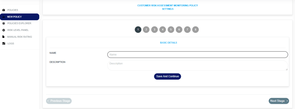- On stage 1, fill in the basic details of the policy (Policy name and description) as displayed in the image below.
