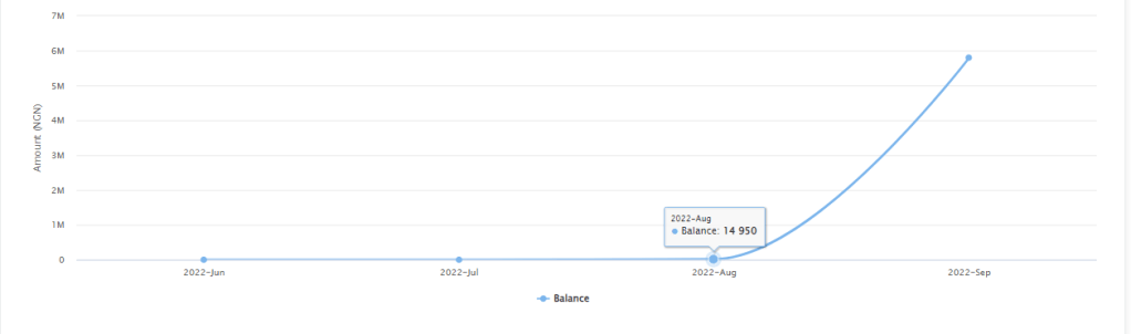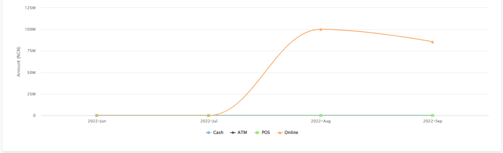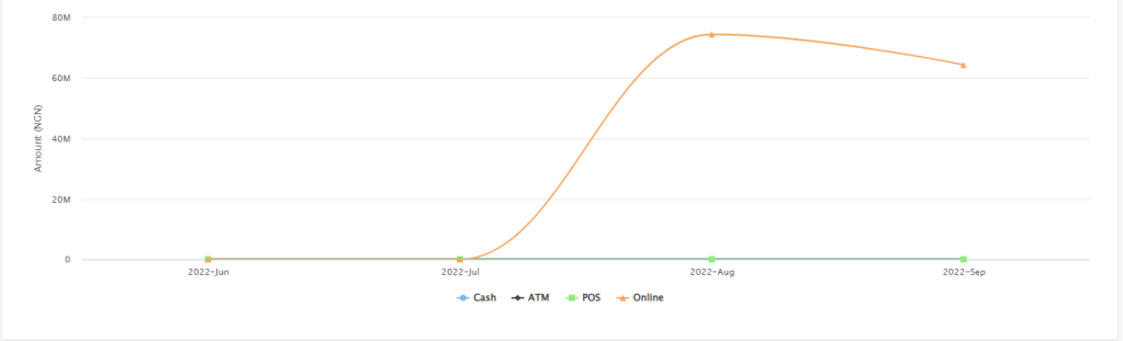 DEBIT SECTOR VALUE TREND: This is a value-based Line graph trend type that gives a graphical representation of an account’s outflows transaction value across different transaction sectors (Cash, ATM, POS, Online) for a specified period.