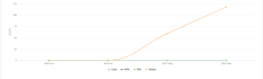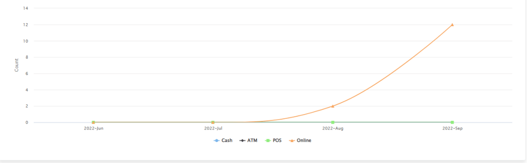 DEBIT SECTOR VOLUME TREND: This is a volume(counts) based Line graph trend type that gives a graphical representation of an account’s outflows transaction volume(counts) across different transaction sectors (Cash, ATM, POS, Online) for a specified period.