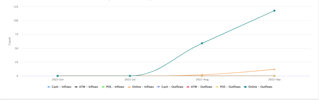CREDIT-DEBIT SECTOR VOLUME TREND: This is a volume(counts) based combined Line graph trend type that gives a graphical representation of an account’s inflows and outflows transaction volume(counts) across different transaction sectors (Cash, ATM, POS, Online) for a specified period.