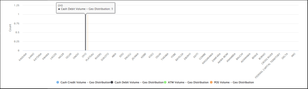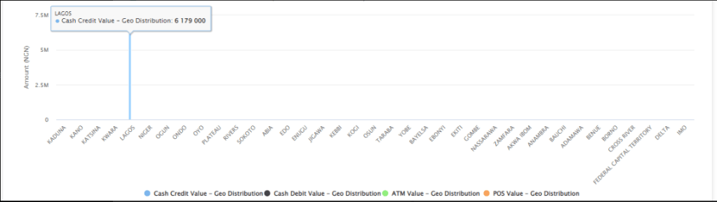 CASH-ATM-POS VALUE GEO DISTRIBUTION: This is a value-based Bar graph trend type that gives a graphical representation that is focused on an account’s transaction value across the states in a country and the ATM and POS transaction sectors for a specified period.