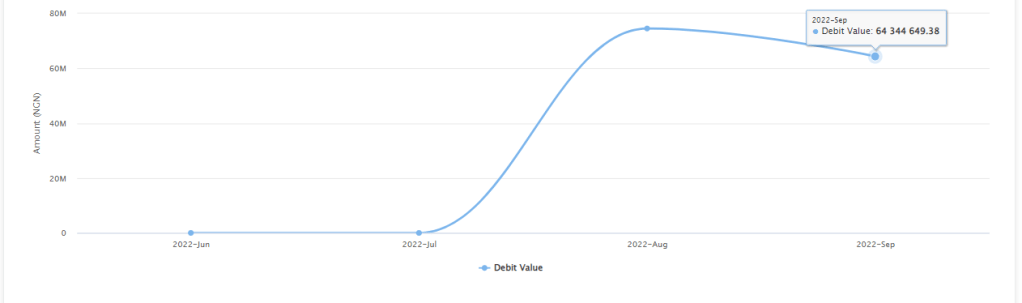 DEBIT VALUE: This is a value-based Line graph trend type that gives a graphical representation of an account’s outflows value across a specified period.