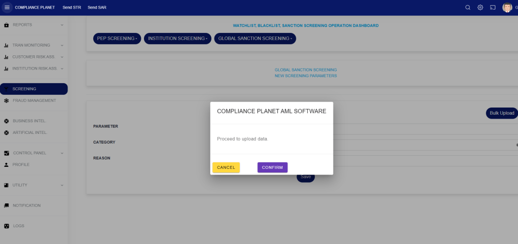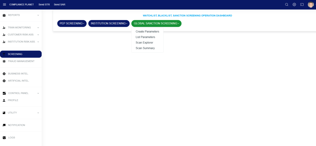 STEP 6: From the top menu, click “Global Sanction Screening”, this action will display a dropdown menu as seen in the image below. From the dropdown menu, click “Create Parameters”.