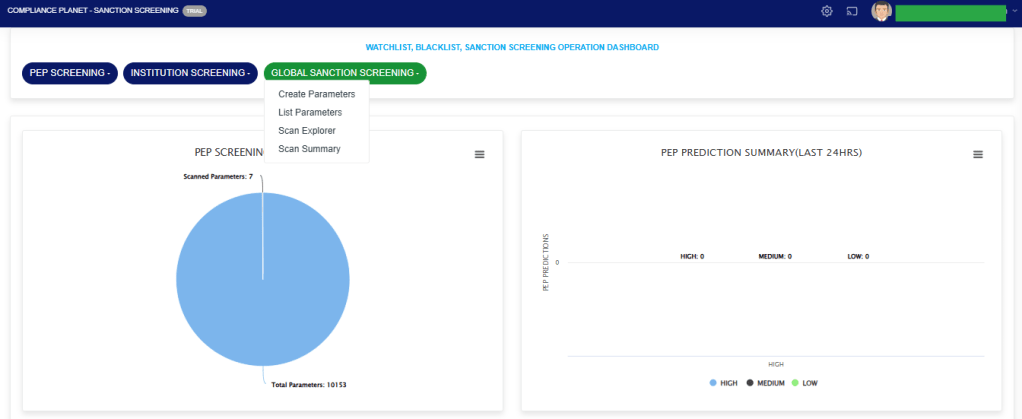 STEP 2: From the top menu, click “Global Sanction Screening”, this action will display a dropdown menu as seen in the image below. From the dropdown menu, click “Create Parameters”.