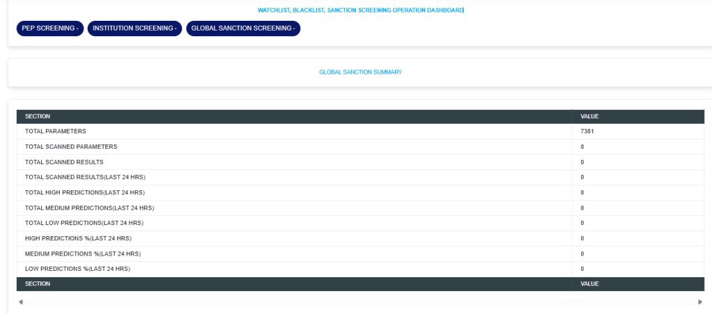 STEP 2: The “GLOBAL SAANCTION SCREENING PARAMETERS” page shows the list of parameters that have been entered into the software and their scan status.