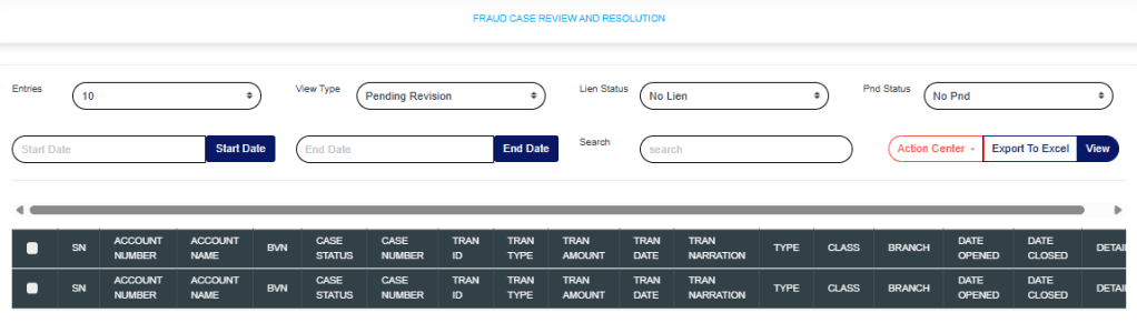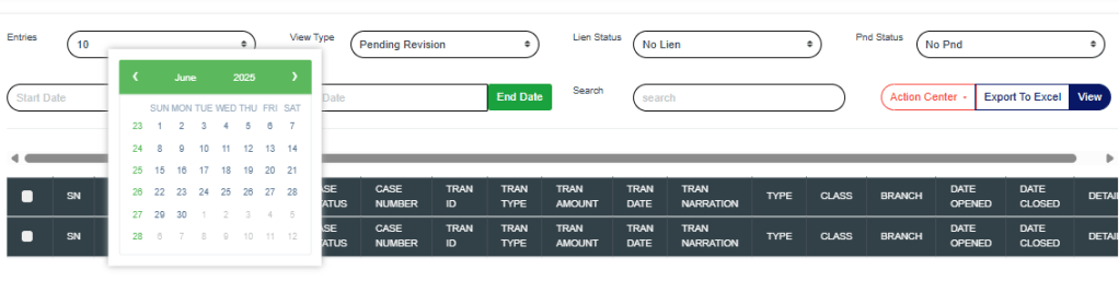 Action Center: Click on the “Action Center” drop-down to perform quick actions on Lien Selected transactions, Place Selected Accounts on PND, or Review Selected Accounts.