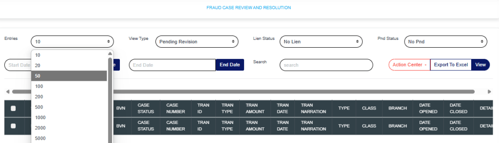 Entries: Click on the “Entries” drop-down to choose how many case entries you want displayed per page.