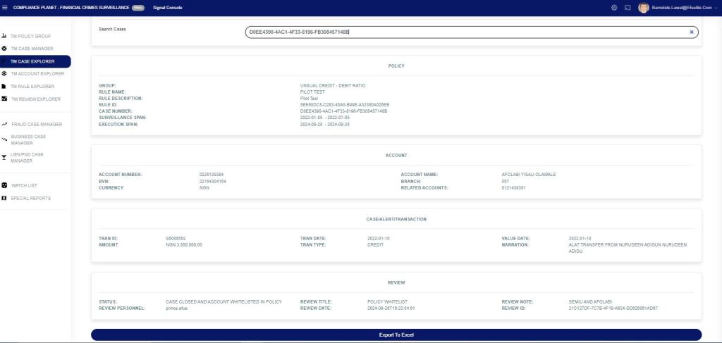 STEP 3: Input the case number to see the details of the account that has bridged the rule, as in Fig. C below. This can be exported to Excel for further review by clicking the “Export to Excel” button.