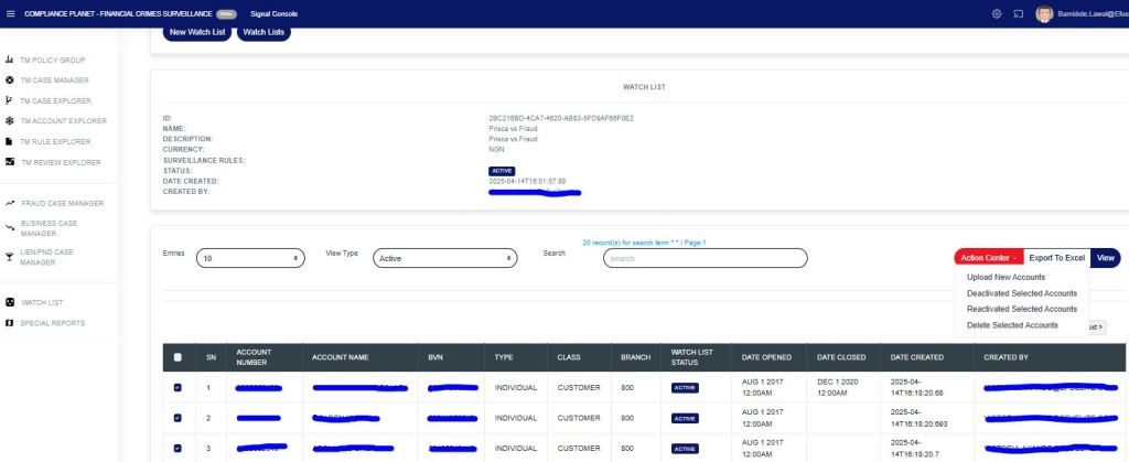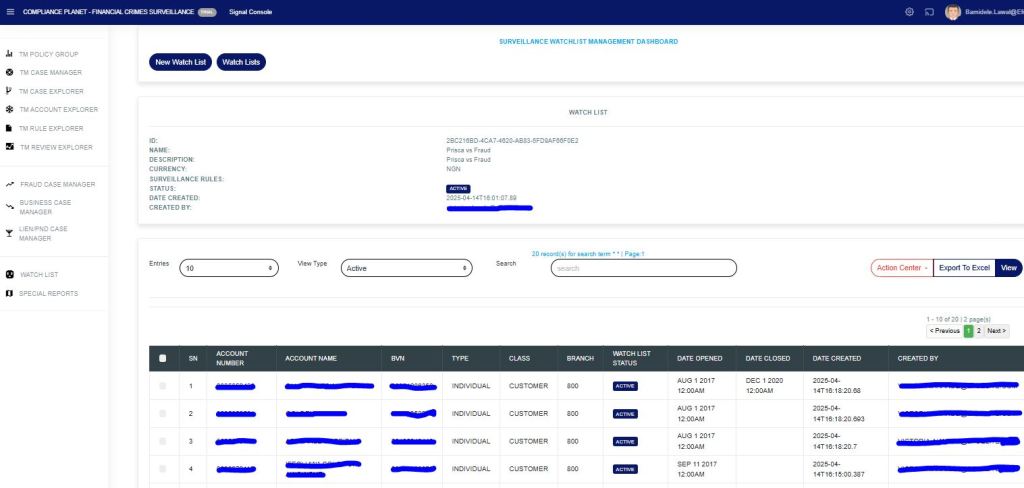 The table in the watchlist displays the customer’s account number, name, BVN, type, branch, watchlist status, account opened date, account closed date (if the account is closed), and the email of the personnel that created the watchlist.