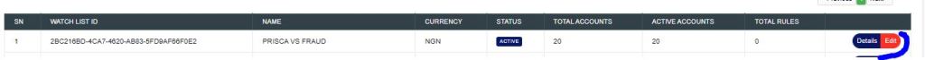 STEP 4: Click on “Details” as in Fig 2d below, this displays detailed information of the selected watchlist. The ID, watchlist Name, Description, Currency, Surveillance rule(s) where is watchlist has been categorized, Status of the watchlist, Date the watchlist was created, and personnel that created it.