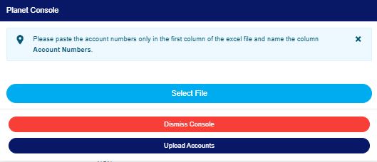 For bulk uploading of new account(s) operations, click “Upload New Accounts”, as shown in Fig. 2e below. This displays a drop-down to select a file (an already prepared Excel file with the first column of the Excel file containing the account number(s) of customers and a heading for the column “Account Numbers”). Then, click “Upload Accounts” to upload the selected Excel file. This will automatically bulk upload the accounts searching through the solution, bringing all the data related to the account number.