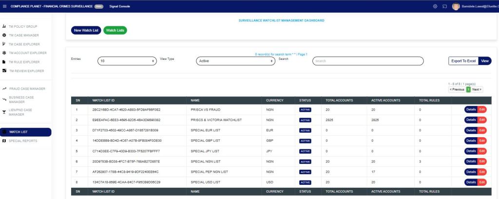 STEP 3: Click on the “Watch Lists” as in Fig 2c below, this displays entries (number of data per page), view type (active or inactive watchlist), search (to search for specific watchlist), view (the display the searched watchlist), export to excel to view the watchlist in an Excel sheet.