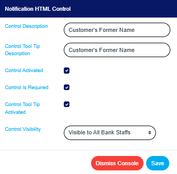 Control Visibility: Click on the ‘Control Visibility’ dropdown’ and select whether the control should be visible to compliance team members only, non-compliance team members only, or all bank staff.