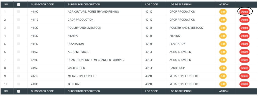 - To delete the Subsector, click on the delete console as shown in Fig.2.6g