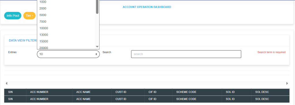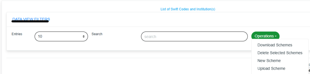 - Fill the entries box with the number of pages you want to view by clicking on the dropdown button, and also fill the search box with your choice of scheme from the Operations dropdown.