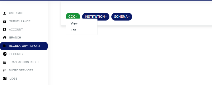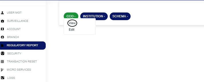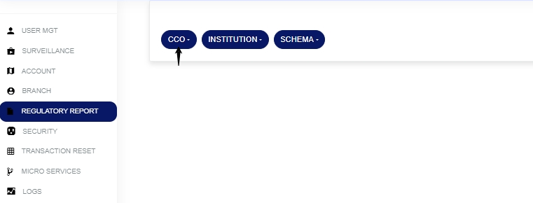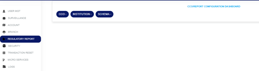 Click “REGULATORY REPORT” from the drop-down menu to open the CCO/REPORT CONFIGURATION DASHBOARD page. See the image below as shown in Fig.3.1a