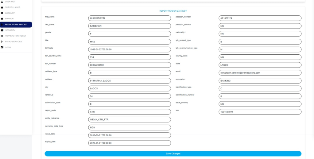 - Note that the “report person data” page contains all the necessary information required to file a regulatory report, and each box must be filled out.
