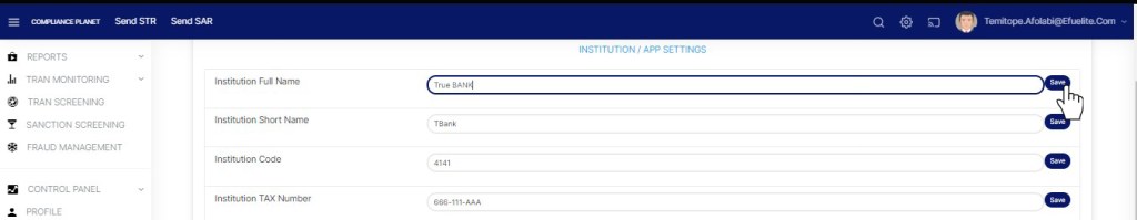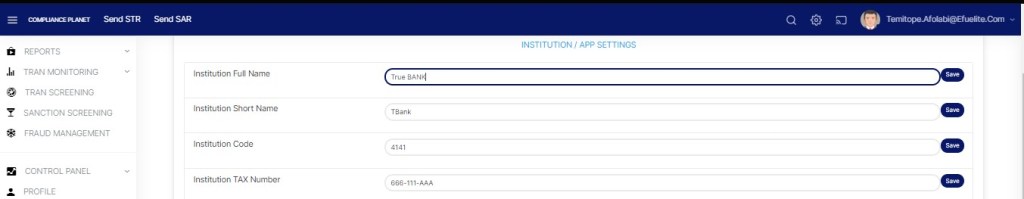 How to Edit Institution Data Settings On Control Panel In Compliance Planet Anti Money Laundering/Core Banking Finance Software