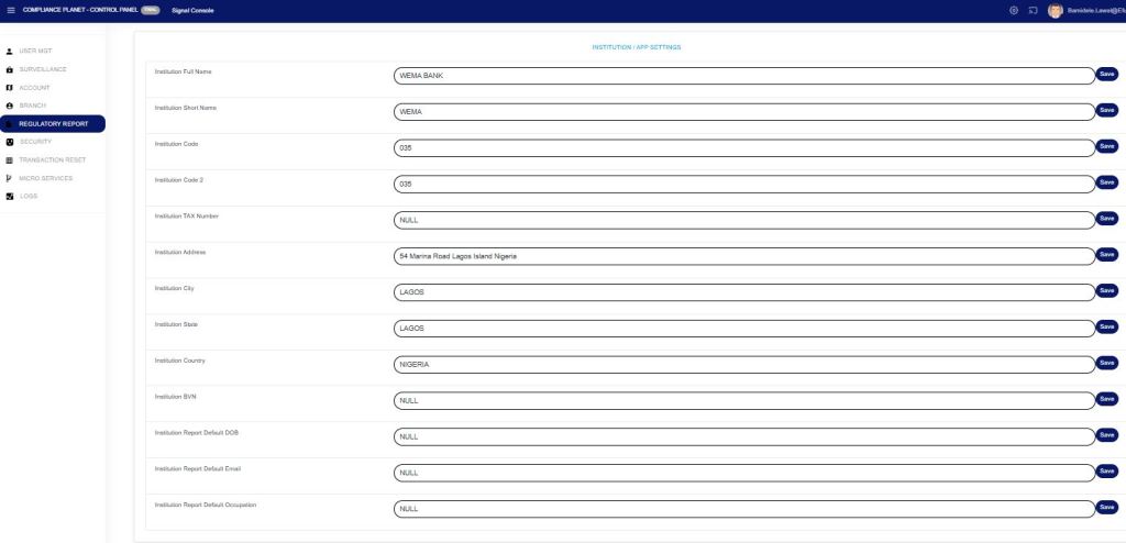 In this section you can edit the bio-data of the institution, this includes; the full and short name of the institution, the institution code, tax number, Bvn, address, year of establishment, default email and default occupation. This section provides a guide on how to perform operations as regards institution settings on the Compliance Planet, with step-by-step instructions and pictures.