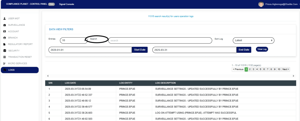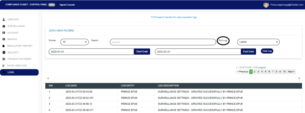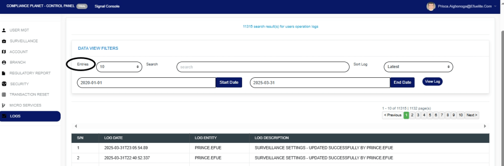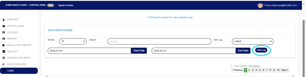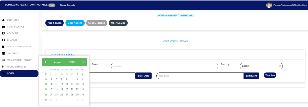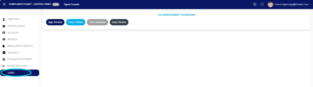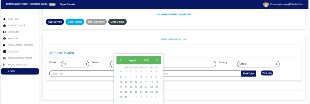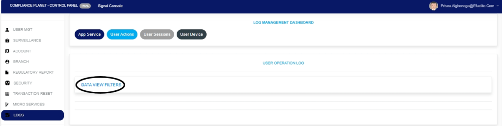 The User Action log provides a list of activities or actions that were carried out successfully and completed on the Compliance Planet software in a chronological order at any time. Here is how to view a user log for any period.