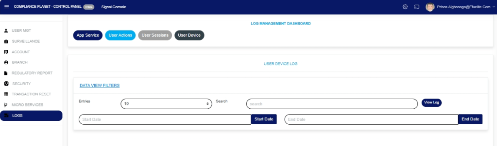 The User Device Log page displays a record of user devices currently logged in to the Compliance Planet AML software.