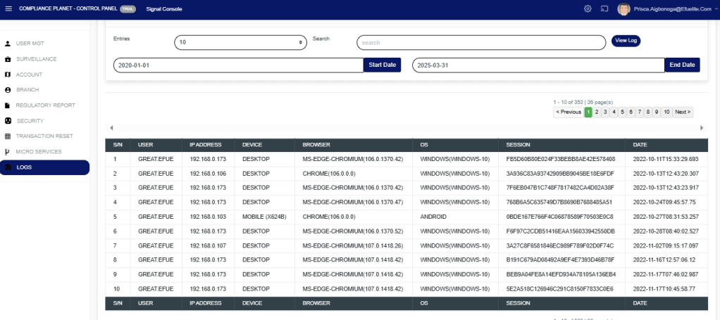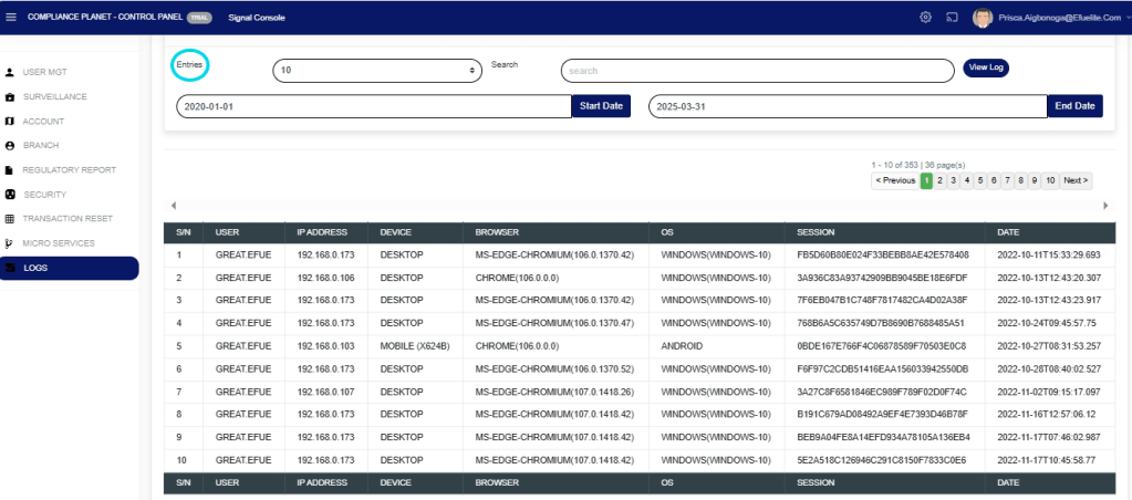 STEP 5: This will display a page showing the records of users’ devices that are currently logged in to the software. The page also provides information such as the device IP Address, Browser, Operating system, and date the device was used to log into the software, as in Fig. 28.6h below