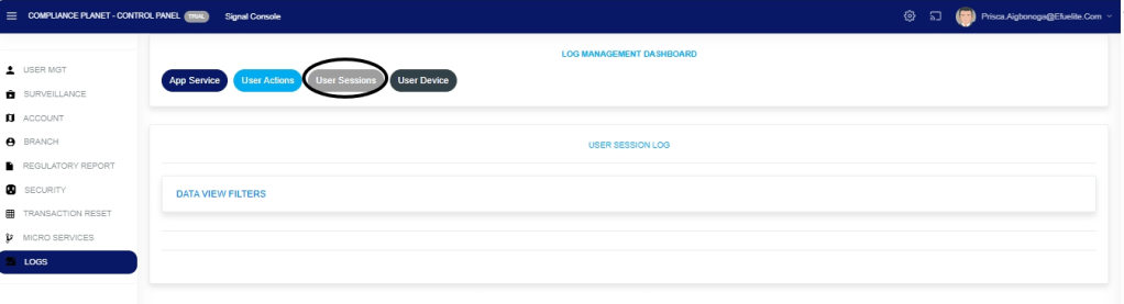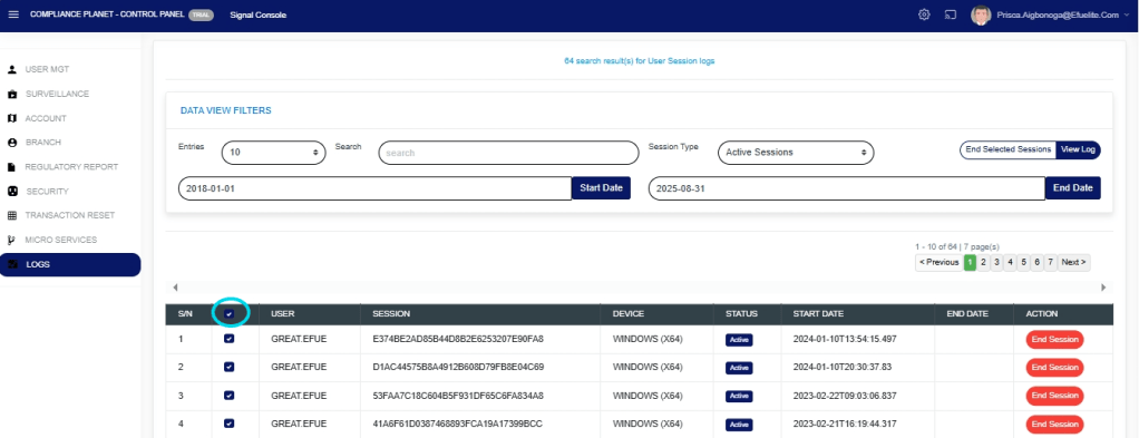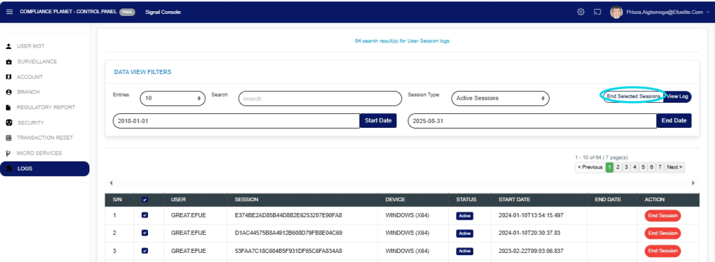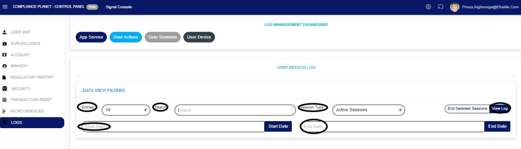 The User Session Log page shows a record of active and inactive users’ sessions. A new session starts when a user logs into the software on a new browser or device and ends when the user logs out.