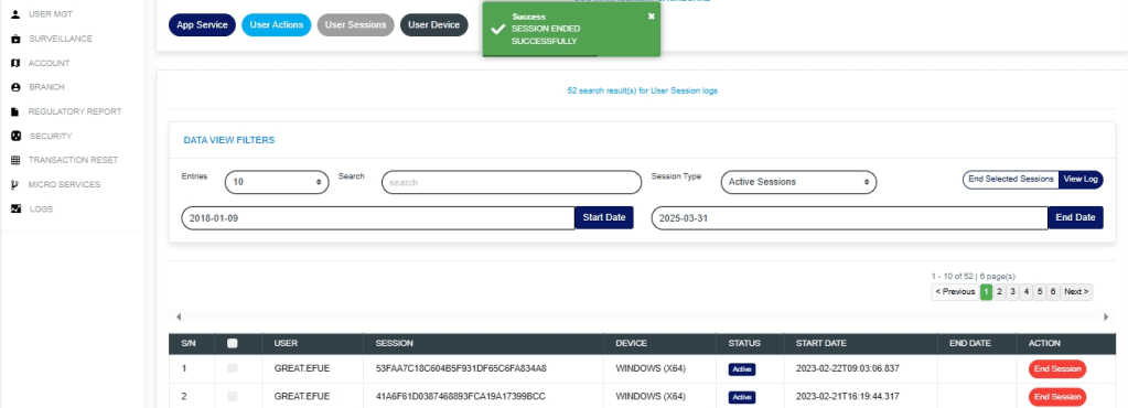 This will display a page, as shown in Fig. 28.5f below, which lists user sessions that are currently Active within the specified date range. The page also provides additional information, such as the user’s device, session status, session start date, and end date.