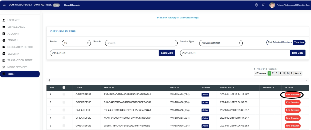 STEP 5: Click the “End Session” button attached to a user’s record, as in Fig.28.5g below, to end that session.