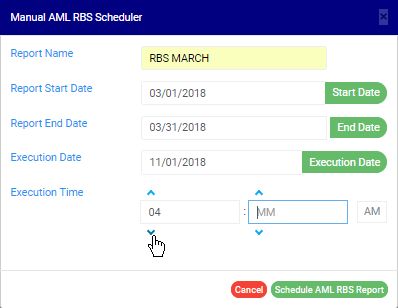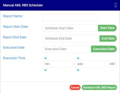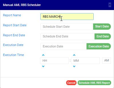 STEP 6: Click on ‘SCHEDULE AML RBS REPORT’ as in fig. 7.3j below to create your report or ‘CANCEL’ to close the console. These buttons are at the bottom-right corner of the console.