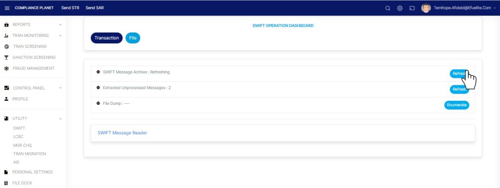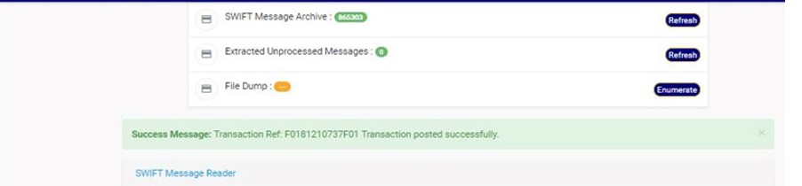 This displays a page as in fig. 30.3d. On this page the software give information on the number of Swift messages archived, extracted unprocessed messages and file dump. You can refresh these data by clicking the “Refresh” button as shown in fig 30.3d below