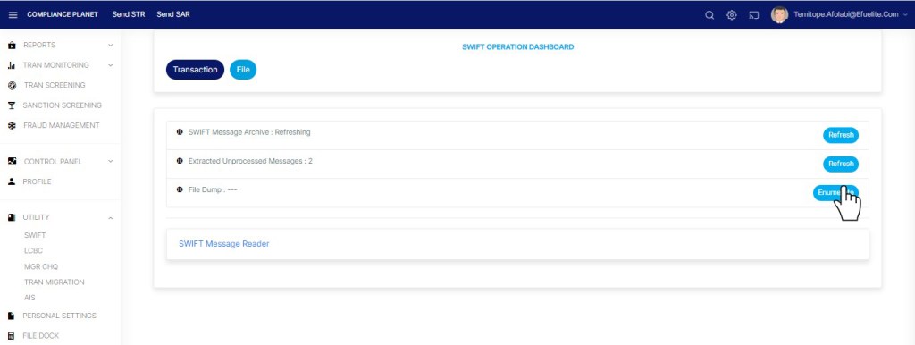 The SWIFT dashboard also gives information on the number of SWIFT files processed by the software on the server. This figure can also be refreshed by clicking on its ‘Enumerate’ button as in fig. 30.3e below