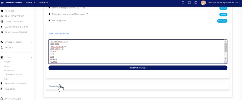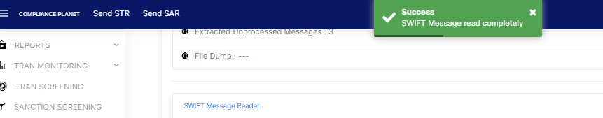 By clicking on ‘Confirm’, the compliance planet software SWIFT reader will read the message, and place a transaction folder at the right side of the console and a notification will be displayed at the top of the page. The number of transaction folders represents each transaction reported in the SWIFT message translated. See fig. 30.4f below for an example.