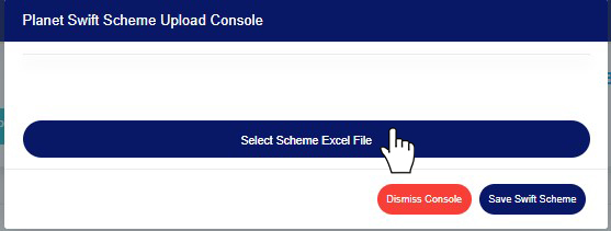 This downloads an excel file with pre-filled headings according to the specification for uploading swift schemes. Open the file, fill in the required details of the new SWIFT schemes and save the changes to the file. Renaming the file on your computer is optional. Now you have a file to upload. Click on ‘Select Scheme Excel File’ to select the file.