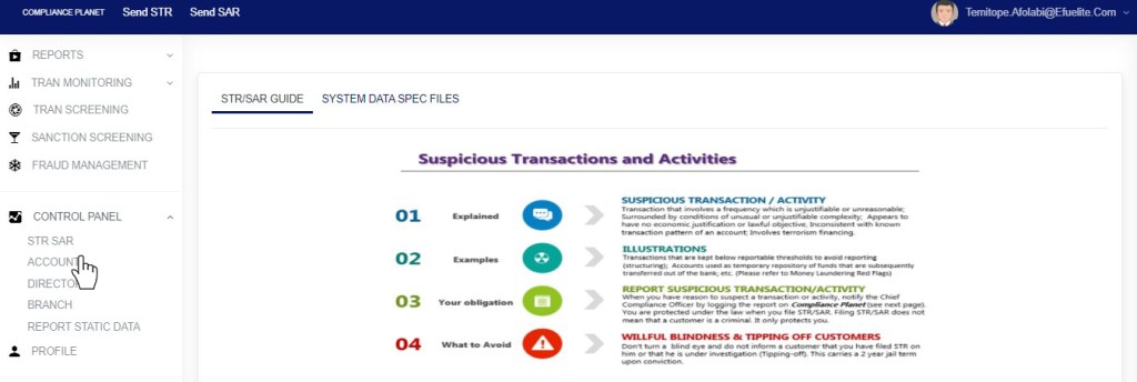 This will display STR SAR CONTROL PANEL OPERATION dashboard as in fig 22.1c below.