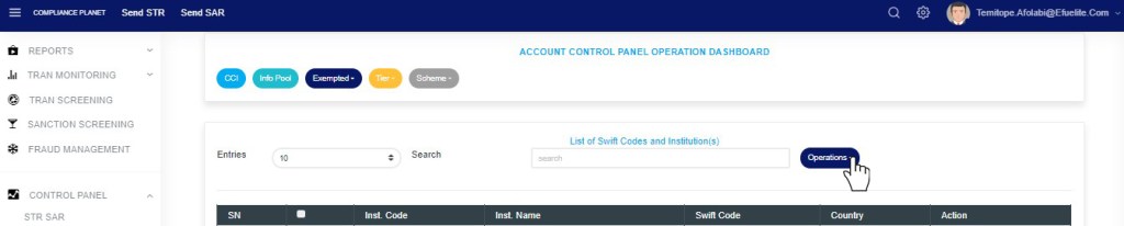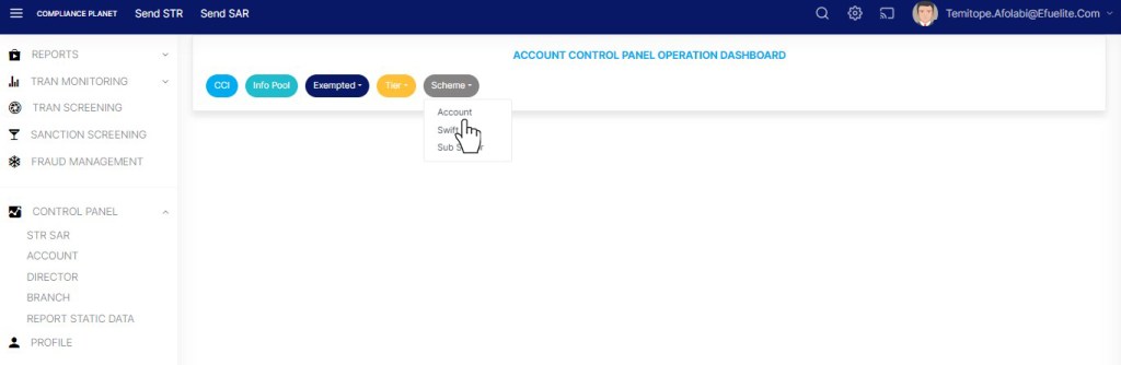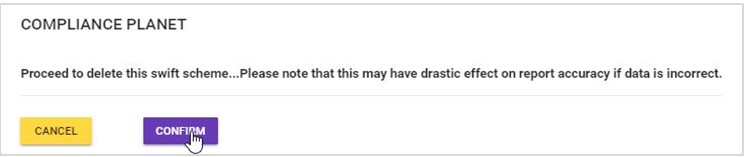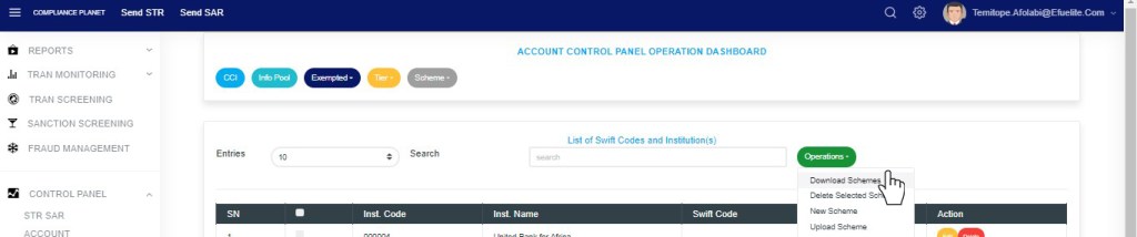 Under this control panel feature, the compliance planet provides a list of account schemes a financial institution has. The operations include editing, deleting, downloading and adding new account schemes, with options to carry out operations individually or in bulk.