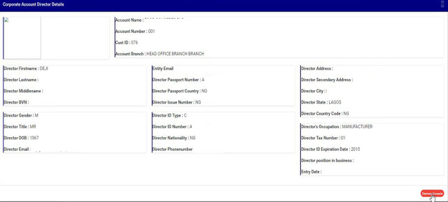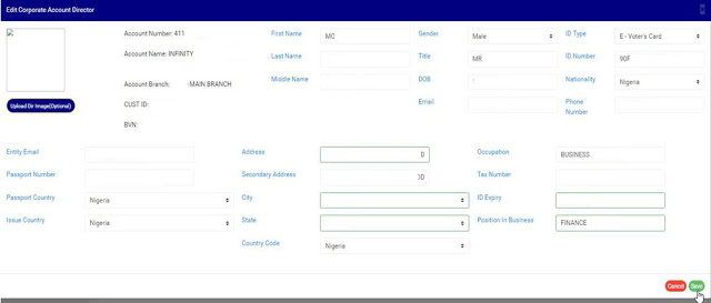 ● This displays the ‘Edit Corporate Account Director’ console where you can edit the information previously saved and also, add other details in the fields that are yet to be filled. Note that the account number, account name, account branch, customer ID and BVN cannot be changed. See an example of the console in fig. 10.5i.