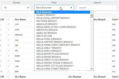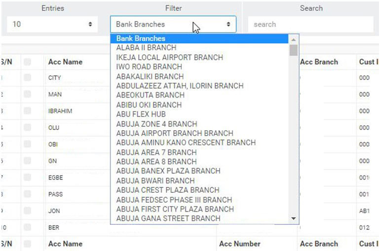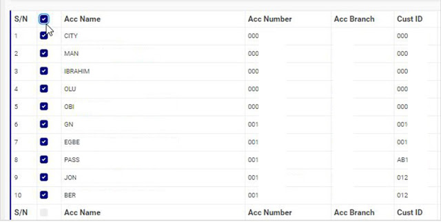➔ To select or deselect all the accounts, click on the checkbox on the table title bar, that is, the checkbox between ‘S/N’ and ‘ACC NAME’. See fig. 10.5t for an example.