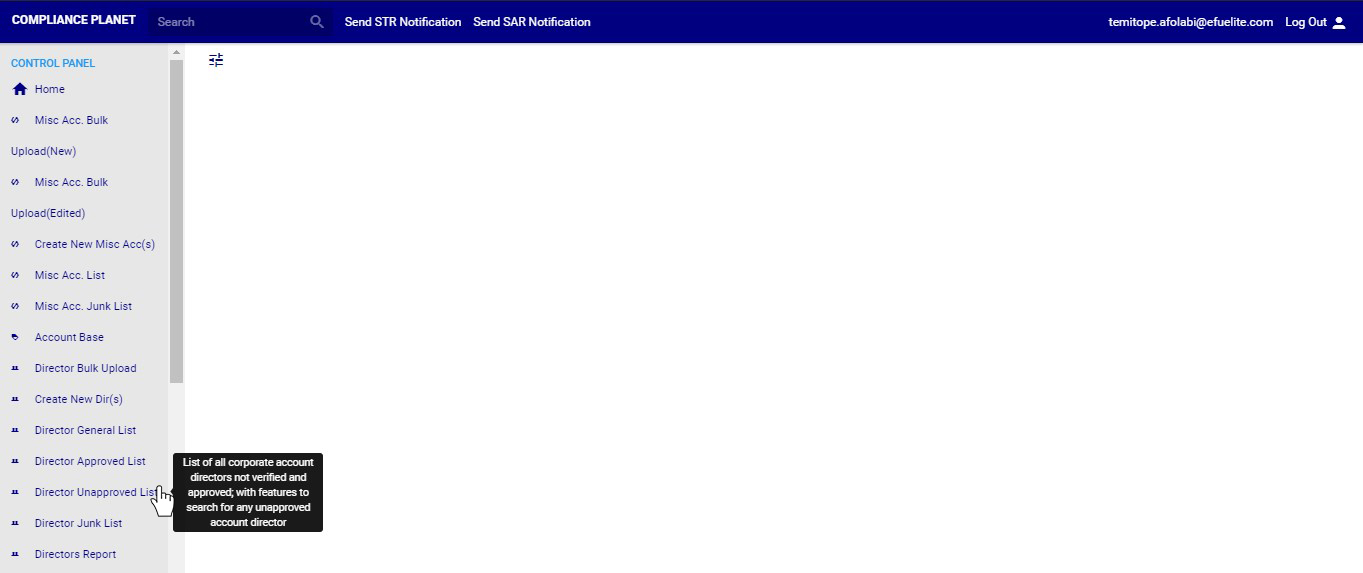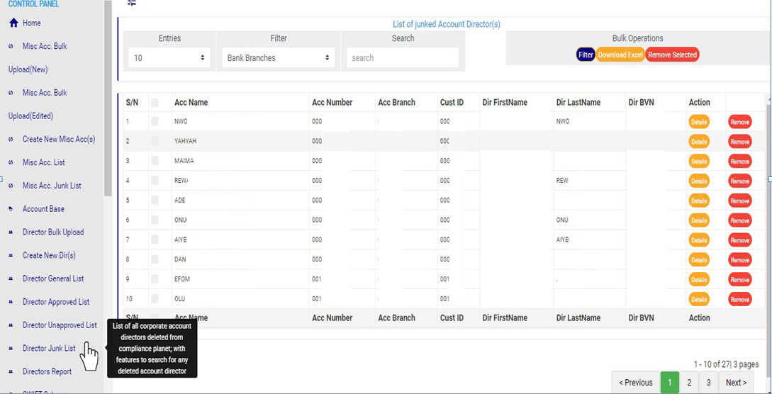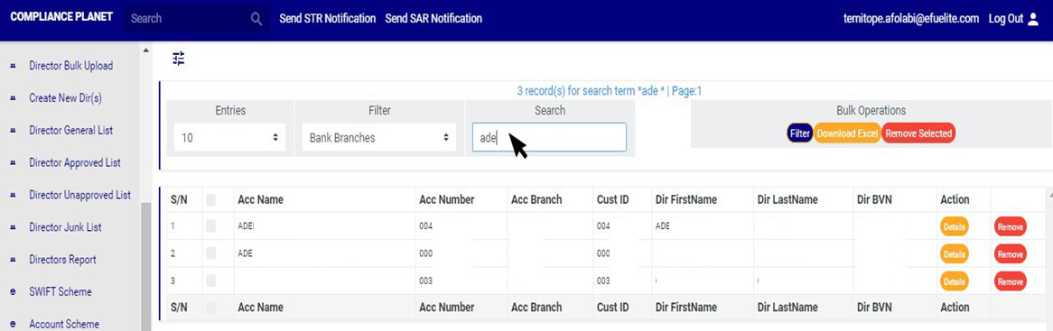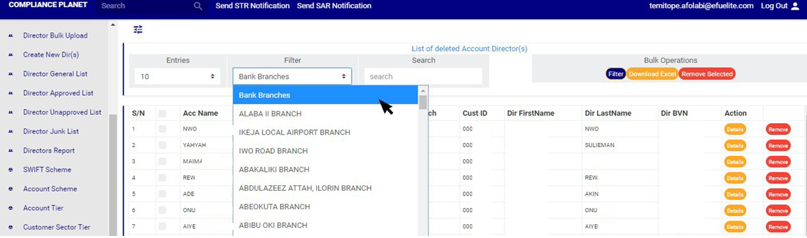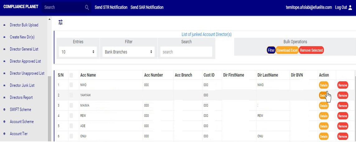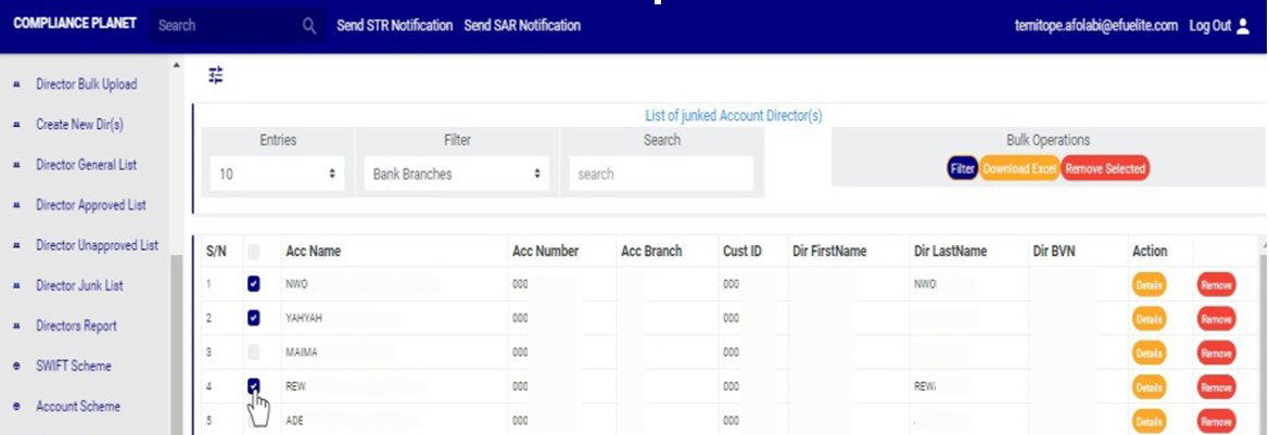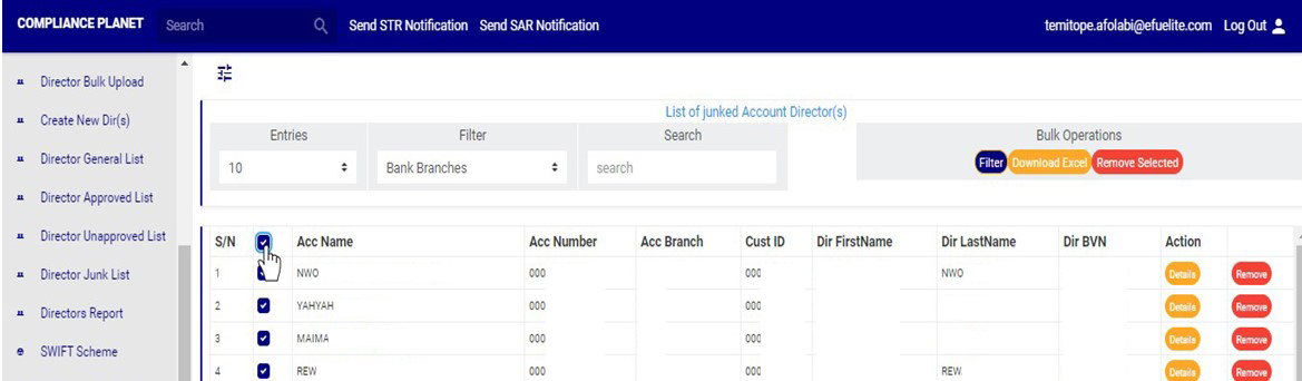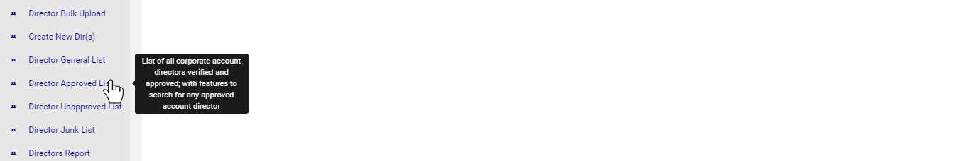 By clicking on the ‘Delete Selected’ button, all the selected director information will be removed from the general list and the approved list, and added to the account directors junk list.