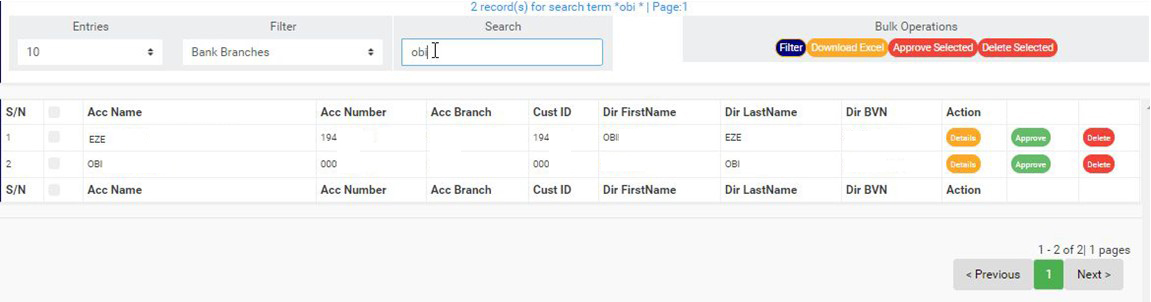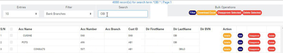 ➔ Search for a corporate account director information by typing the account name, account number, director’s first name, last name or director’s BVN in the search box. See an example of a search in fig. 10.5e below. Search results will be displayed as you type in the search box.
