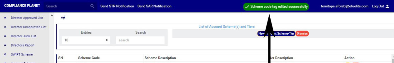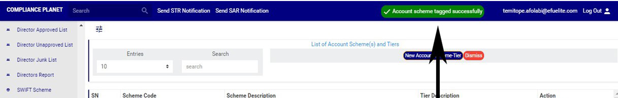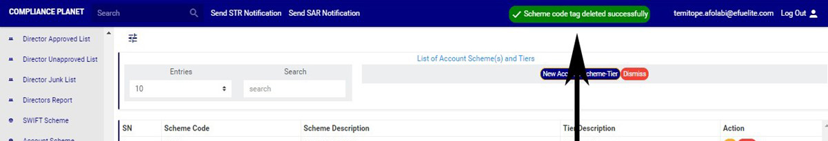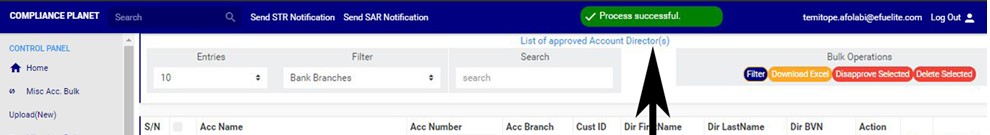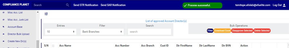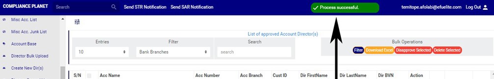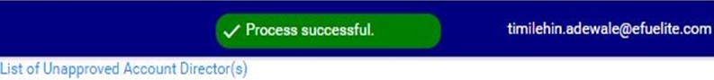 ● When the operation is complete, a notification as in fig. 10.5q will be displayed at the top of the page, the deleted account director information will removed from the general list and the approved list and added to the Account Directors Junk List.