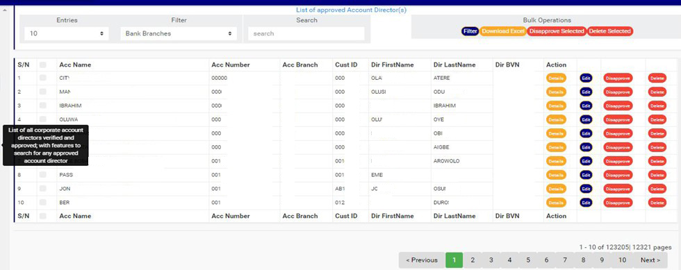 The ‘APPROVED LIST’ page provides a list of all corporate account directors’ information that have been verified and approved by the financial institution .Here, the details of corporate account director can be viewed, edited, deleted and disapproved, either individually or in bulk. Here are steps on how to make use of the features on the Approved list page.