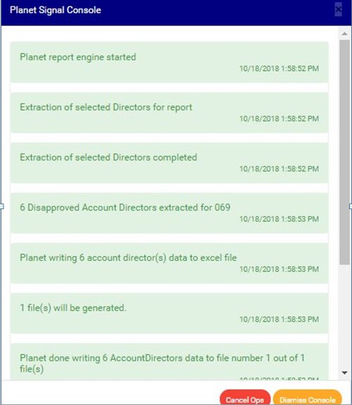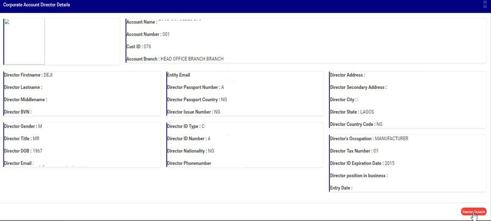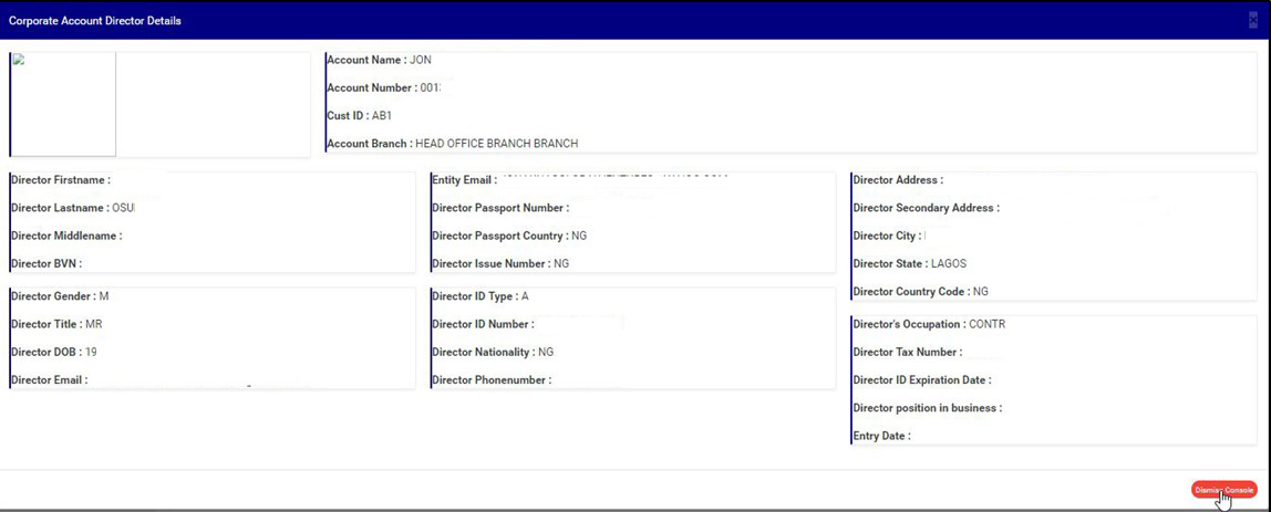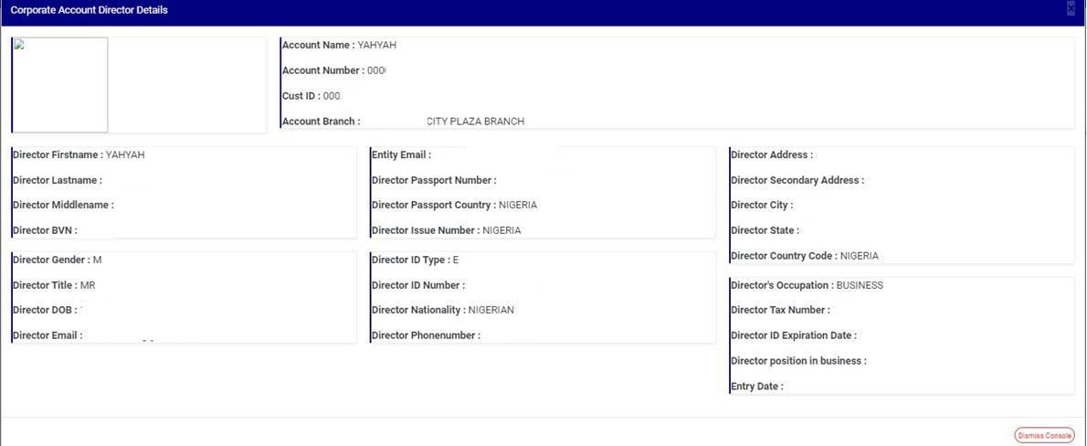 ● This display the Corporate Account Director Details console as in fig. 10.4g below. After viewing, click on ‘DISMISS CONSOLE’ (as shown below) to close the console.