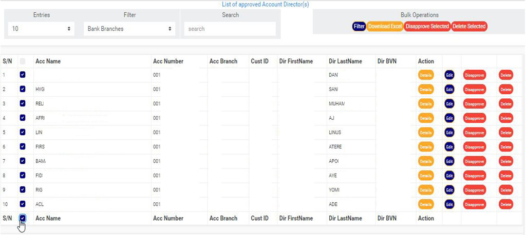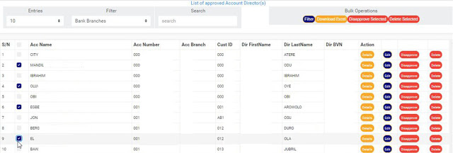 ➔ To carry out any bulk operation, select the corporate account director information. Select the account director information by clicking on their check boxes. See fig. 10.5s below for an example.