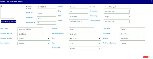 ● This displays a ‘Edit Corporate Account Director’ console where you can edit the information previously saved and also, add other details in the fields that are yet to be filled. Note that the account number, account name, account branch, customer ID and BVN cannot be changed. See an example of the console in fig. 10.4i.