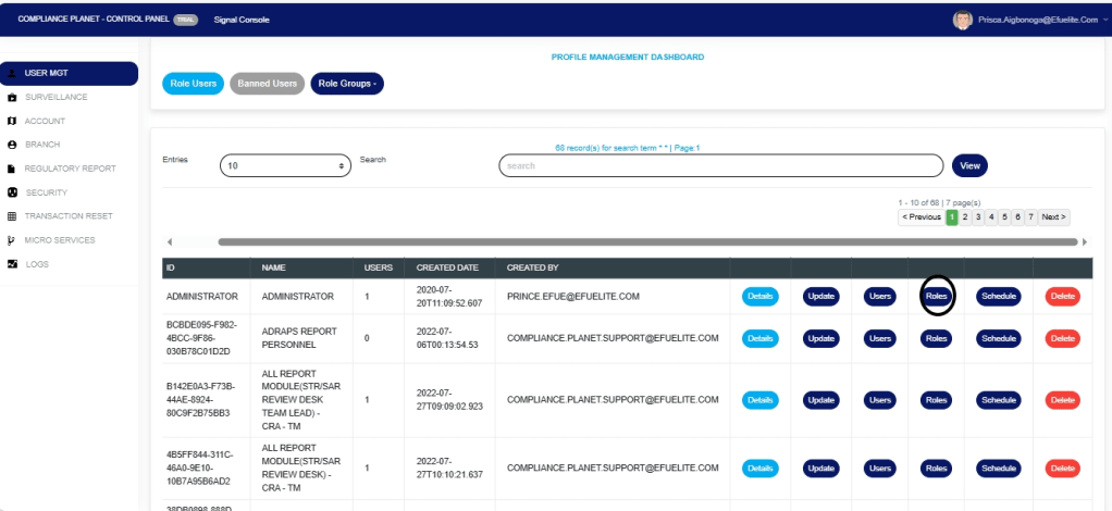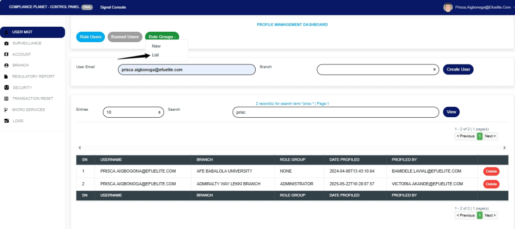 STEP 6: Click on the “Role group” button drop-down and select the “List” to reveal the list of role groups as seen below: