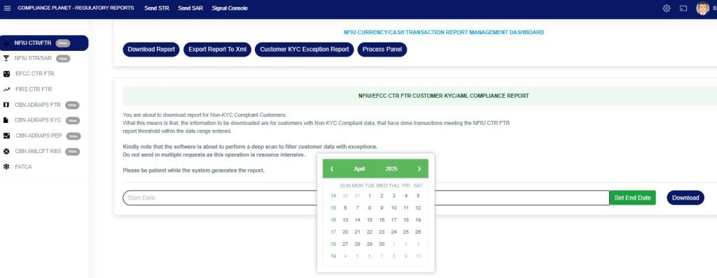 This provides a downloaded report on customers with incomplete data (as defined by the NFIU) who have carried out reportable transactions.