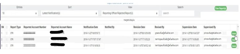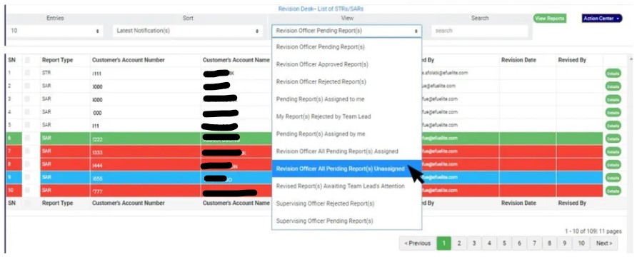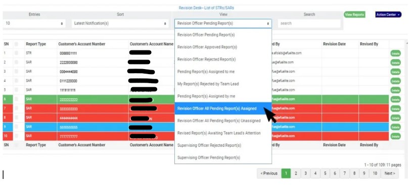 STEP 1:To re-assign Notification(s) to any member on the revision desk team, Click the VIEW box still on the NFIU STR/SAR revision page; select ‘Revision Officer All Pending Notifications assigned’, then click on the “view report” button. See fig 6.3af for an example.