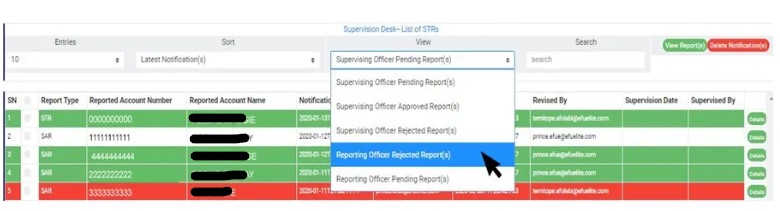Supervision Officer Rejected Notification(s); these are STR/SAR notifications that are not satisfactory to the supervision officer. When a Notification is rejected by the supervision officer, the revision officer will get a mail notification to revisit the Notification and send it again if needed. The Notification this time around will include reason(s) for rejection.